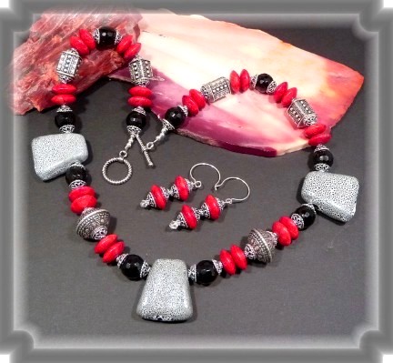 This design still incorporates four very different textures: ceramic, cut coral, polished gemstones and metalic silver plate. Grey Ceramic Axe-shapped Beads are the focal point of the necklace, highlighted by Red Sponge Coral rondels, faceted Black Agate (onyx) beads and silver plated accent pieces with silver toggle clasp.